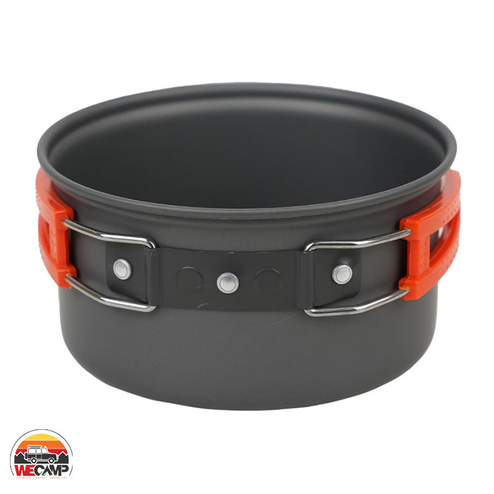 ست شامل: قابلمه، ماهیتابه، کاسه، ملاقه، کفگیر چوبی، اسکاچ، کیف حمل پارچهای مقاوم