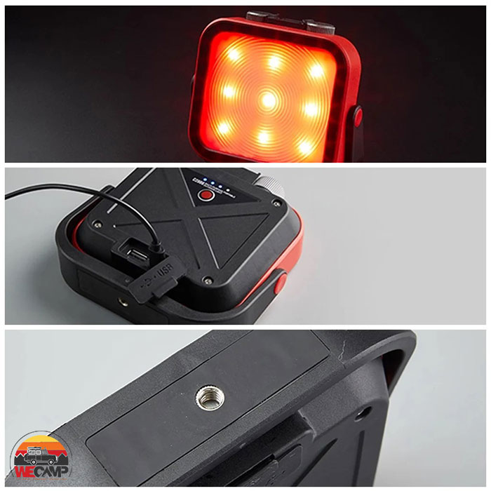 🔹 سایر ویژگیها: قابلیت چرخش 300 درجه، آهنربای قدرتمند، قابل اتصال به سهپایه، دارای دکمه جداگانه برای نور قرمز، دارای نشانگر شارژ باتری