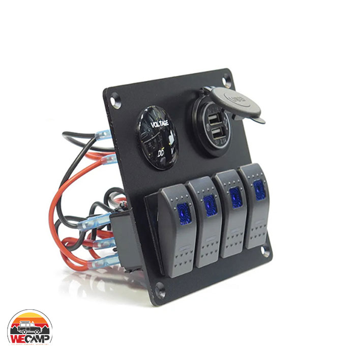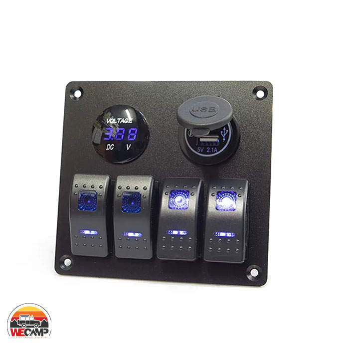 پنل کلید چهارتایی خودرو با ولت متر و خروجی USB – کنترل تجهیزات، شارژ و ایمنی در یک قاب حرفهای ⚡