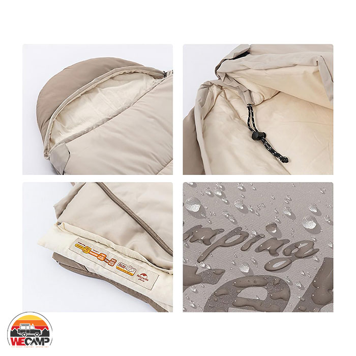 در قسمت بالایی کیسه خواب، کلاه با بند کشی تعبیه شده که مانع ورود هوای سرد به داخل شده و به حفظ دمای بدن در شب‌های سرد کمک می‌کند.